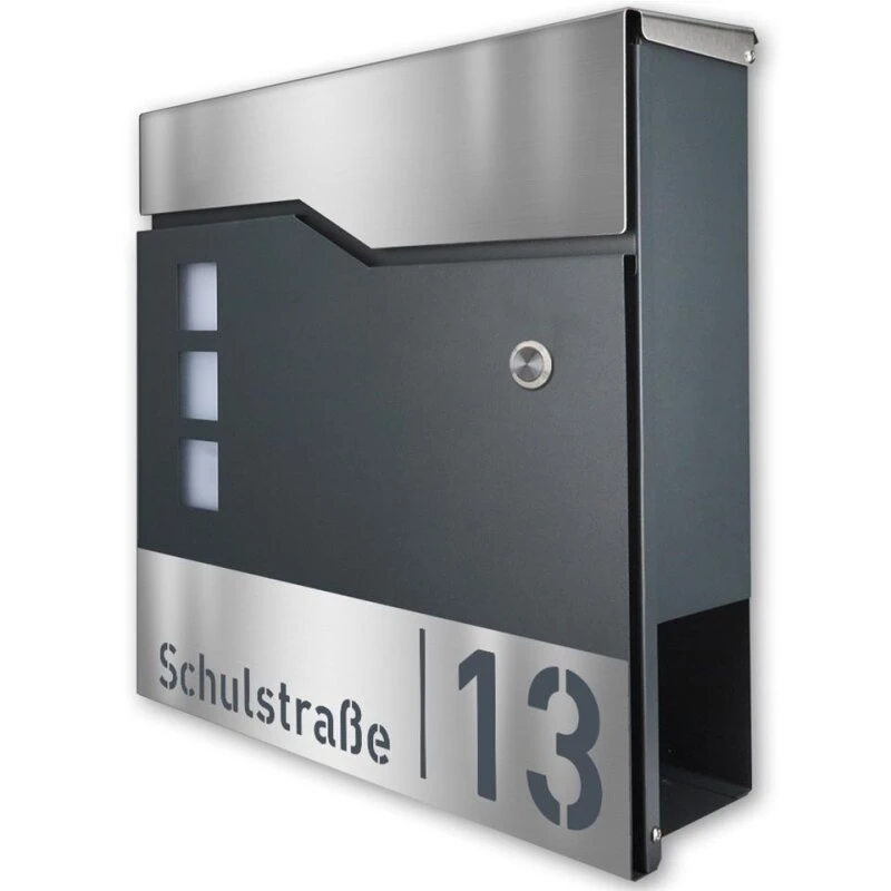 Designer Funk Briefkasten der Besonderen Art in zeitlos schicker Optik. Der Briefkasten verfügt über einen großen Briefschlitz, ist abschließbar und wird mit zwei Schlüsseln geliefert. Montagematerial ist ebenfalls im Lieferumfang enthalten. Weiter befindet sich auf der unteren Seite ein Zeitungsfach, so dass Zeitungen nicht mehr vor der Haustüre im Nassen abgelegt werden müssen, sondern einen trockenen Platz haben, bis sie ins Haus geholt werden. Die Beschriftung erfolgt im Lasercut-Verfahren und ist ein echtes Highlight.