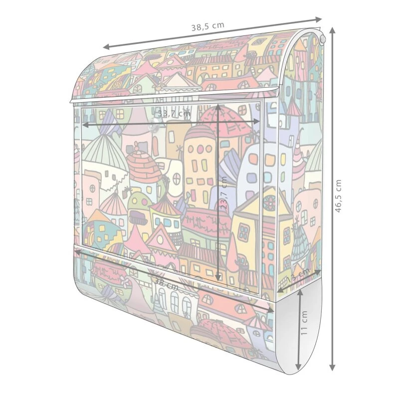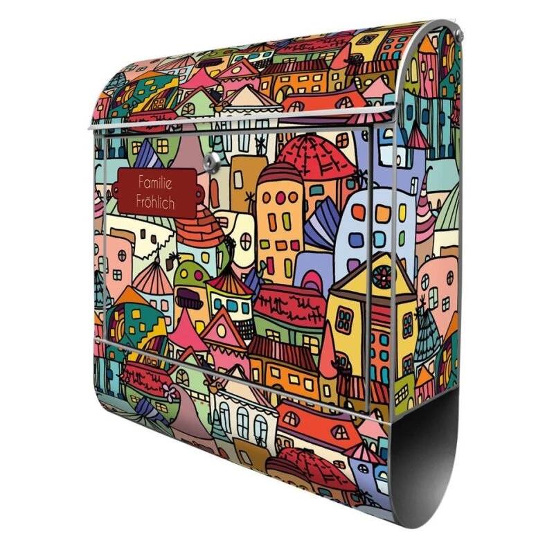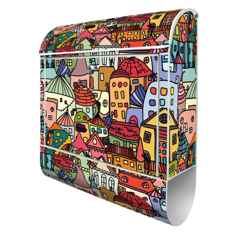 Der Postkasten mit Motiv Funky Town hat ein sehr ansprechendes und ausgefallenes Design, damit entlocken Sie Ihren Nachbarn und dem Postboten ein Lächeln. Heben Sie Sich von der tristen grauen Masse ab, ohne auf Funktionalität zu verzichten.