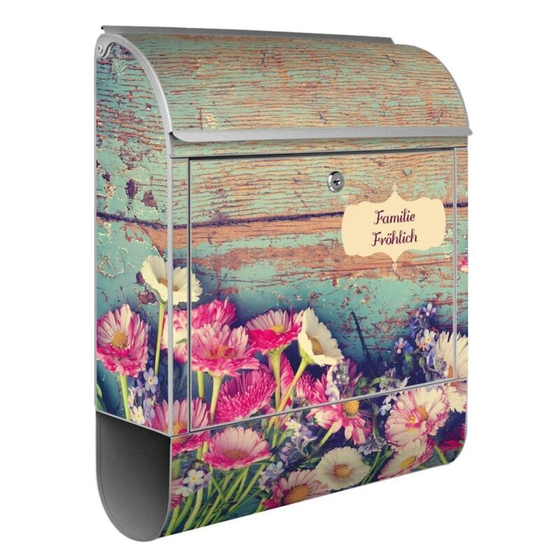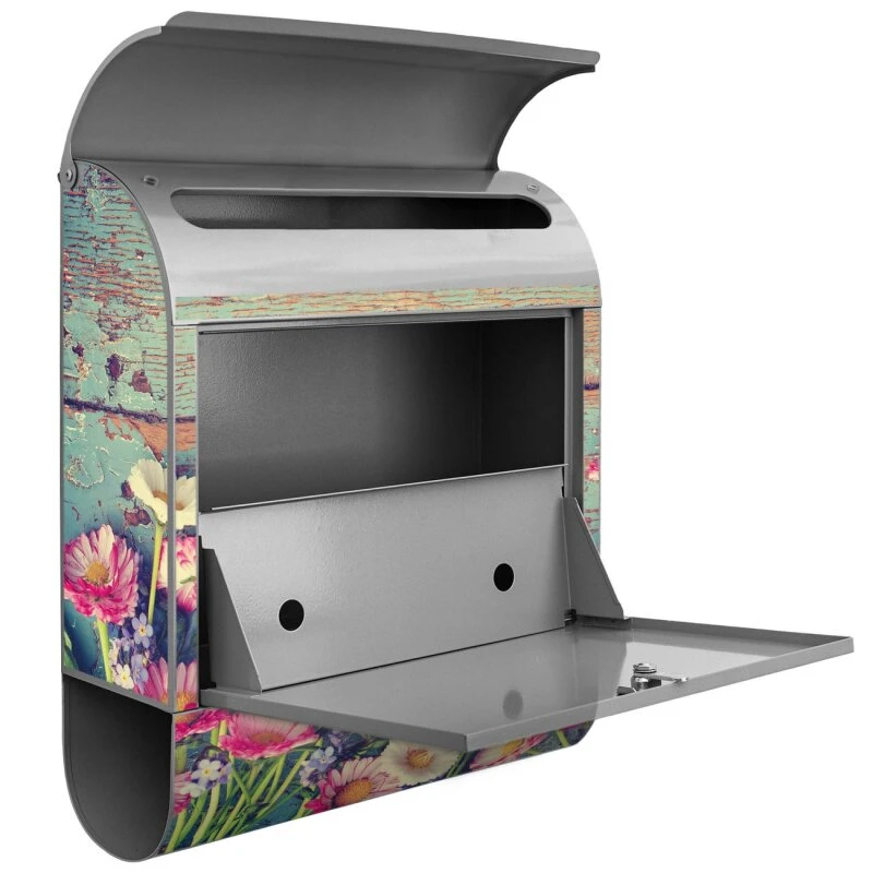 Der Postkasten mit Motiv Blumenpfücken hat ein sehr ansprechendes und ausgefallenes Design, damit entlocken Sie Ihren Nachbarn und dem Postboten ein Lächeln. Heben Sie Sich von der tristen grauen Masse ab, ohne auf Funktionalität zu verzichten.