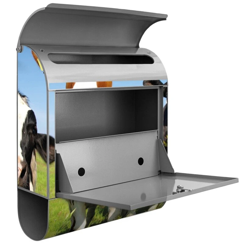 Der Postkasten mit Motiv Kühe hat ein sehr ansprechendes und ausgefallenes Design, damit entlocken Sie Ihren Nachbarn und dem Postboten ein Lächeln. Heben Sie Sich von der tristen grauen Masse ab, ohne auf Funktionalität zu verzichten.